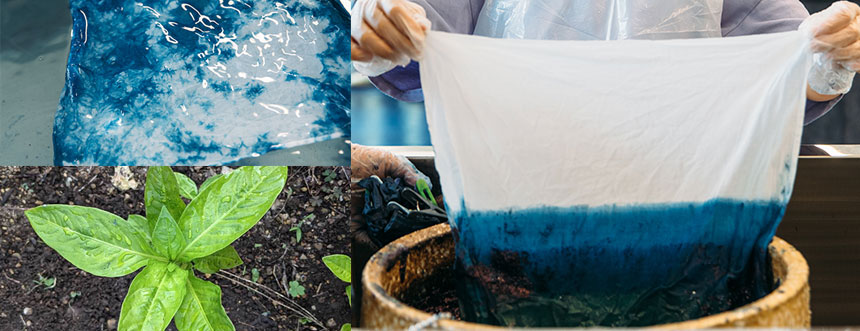• 藍染:藍の入った甕(かめ)に生地を浸けて染色する方法