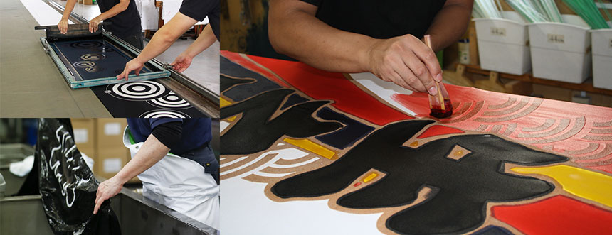 水野染工場では、印染商品を中心に図案から染色、縫製まで一貫しておつくりしています。